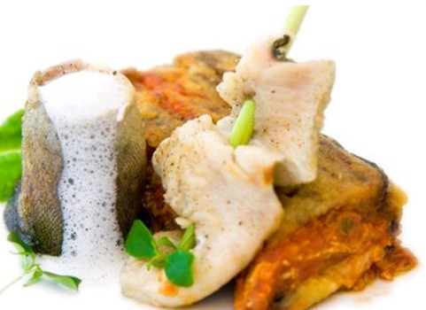 Pstruhy vyfiletujeme. Na každou porci tak budeme mít 2 filátka. Filátka osolíme, opepříme, protkneme do požadovaného tvaru citronovou trávou a upečeme na másle. Lilek si nakrájíme na tenčí plátky a usmažíme do křupava na oleji. Necháme osušit na savém papíru. Na tomatovou omáčku dáme do hrnce rozvařit sekaná rajčata, osolíme, opepříme, přidáme pár lístků čerstvé bazalky a rozmixujeme. Do keramické misky skládáme vrstvu lilku, osolíme a opepříme, potřeme vrstvou rajčatové omáčky, posypeme parmazánem a takto pokračujeme do výšky cca 5 - 7 cm. Dáme zapéct do trouby na 160 °C na 30 minut. Smetanu svaříme spolu s lístky bazalky, ochutíme solí a pepřem a vyšleháme tyčovým mixérem na pěnu. Zeleninový koláč nakrájíme na čtverce, naskládáme spolu s upečenými filátky na talíř a přelijeme našlehanou bazalkovou pěnou.