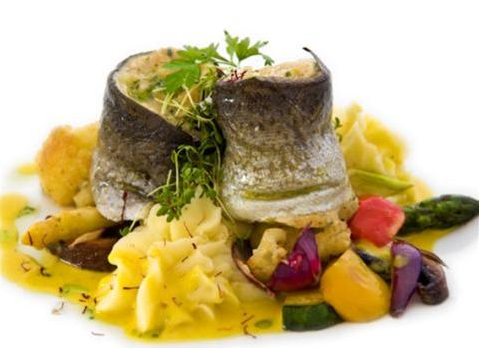 Rozdrobíme střídku bílého chleba, osolíme, opepříme, přidáme nasekané bylinky, smetanu a vypracujeme fáš (nádivku). Pstruha usmrtíme, vykucháme, zbavíme šupin a vyfiletujeme. Filety osolíme, opepříme a naneseme připravenou fáš, stočíme do závitku a propíchneme párátkem. Ze zbytku pstruha uděláme vývar. Do hrnce dáme kořenovou zeleninu, vodu a bílé víno. Závitky dáme na pařák a vaříme v páře cca 10 minut. Šafrán zabalíme do alobalu a dáme na cca 3 minuty do vyhřáté trouby a poté ho přidáme do vývaru a svaříme na poloviční množství. Dochutíme citronovou šťávou, solí, pepřem a zjemníme smetanou. Zeleninu orestujeme na másle a dochutíme. Z brambor připravíme pyré a ochutíme muškátovým oříškem. Podáváme ozdobené bylinkami.