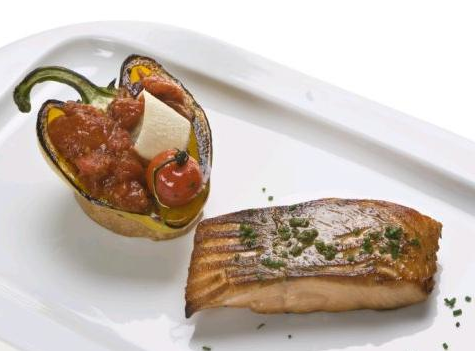 Lososa naporcujte na 4 filety. Na pánvi rozehřejte 3 lžíce oleje a rybu na něm z obou stran opékejte na středním plameni asi 4 minuty (celkem 8 minut). Mezitím překrojte napůl papriky, vydlabejte semínka a na další pánvi na oleji je opečte nejprve řeznou stranou dolů, poté ze všech stran dozlatova. V kastrůlku prohřejte rajčata spolu se solí, pepřem, cukrem a bylinkami. Teplé papriky plňte rajčatovou směsí a na nahřátém talíři je podložte plátkem na troše olivového oleje opečené bagety, aby se nesesouvaly. Ozdobte cherry rajčátkem, parmazánem a přidejte lososa osoleného mořskou solí.
