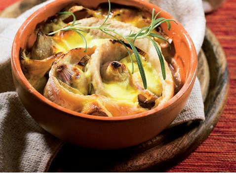 Rybí filety rozdělíme na čtyři části a osolíme je. Čtyři zapékací misky vytřeme olejem. Zakysanou smetanu rozšleháme se žloutkem. Šalotky oloupeme a podélně rozkrojíme na půlky, pórek důkladně omyjeme a nakrájíme na kolečka. Do připravených vymazaných misek stočíme rybí filety proložené rozmarýnem a mezi ně rozdělíme půlky šalotek a kolečka pórku. Ryby se zeleninou v miskách zalijeme smetanou se žloutkem, misky vložíme do trouby vyhřáté na 200°C a pečeme asi 30 minut dozlatova.