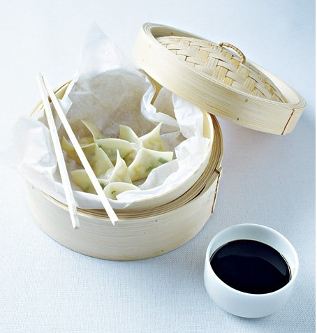 Krevety, cibulku, bambusové výhonky, ústřicovou omáčku, saké, sezamový olej a vaječný bílek smíchejte v míse. Placičku won ton si položte na dlaň, ukazováček druhé ruky namočte do vody a potřete jím okraj placičky tak, aby byl mokrý a začal se lepit. Doprostřed dejte lžičku krevetové náplně a slepte podle obrázku do hvězdice – vždy od rohů ke středu. Nebojte se těsto stisknout. Menších prasklin se bát nemusíte, taštičky se nebudou vařit, ale jen napařovat. Bambusové napařovadlo vyložte bílým pečicím papírem, narovnejte do něj taštičky (případně i do druhého patra) a uzavřete víkem. Do rendlíku jen o trochu většího než napařovák nalijte vodu a přiveďte ji k varu, pak na hrnec nasaďte‘ napařovadlo a napařujte 5 minut. Opakujte se všemi taštičkami. Servírujte se sójovou omáčkou.