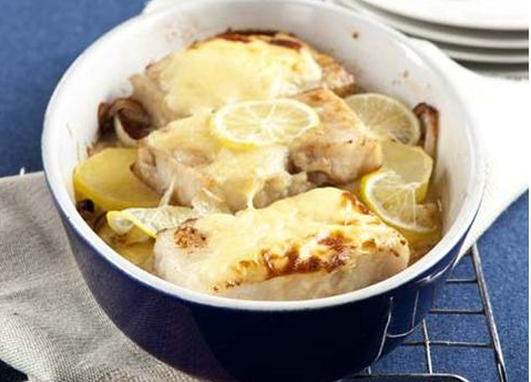 Brambory oloupeme, nakrájíme na plátky a krátce povaříme v osolené vodě. Scedíme je a necháme odkapat. Oloupané cibule nakrájíme na kolečka, orestujeme je na rozpáleném másle dosklovata, přidáme na plátky nakrájené stroužky česneku, zakapeme šťávou z limetky, osolíme a opepříme. Směs přidáme k bramborám, promícháme a přendáme ji do máslem vymazané a strouhankou vysypané zapékací mísy. Smetanu rozšleháme s vejcem a nastrouhaným sýrem. Ještě zmrzlé osolené filé zprudka opečeme na rozpáleném oleji, rozložíme je na připravené brambory, posypeme pepřem, přelijeme připravenou sýrovou omáčkou a pečeme v troubě vyhřáté na 170 °C asi 40 minut. Ozdobíme plátky citronu a petrželkou.