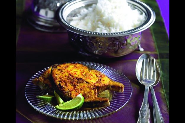 Koriandr, chilli koření, kurkumu, kmín, sůl a citrusovou šťávu promíchejte s asi 6 lžícemi vody, aby vznikla hustá, poměrně slaná kašička. Potřete jí rybí steaky po obou stranách a nechte aspoň čtvrt hodiny stranou. Silnostěnnou nepřilnavou pánev potřete olejem a rozehřejte na středním plameni. Zprudka opečte steaky a hned podávejte s rýží a skrojky citrusu.