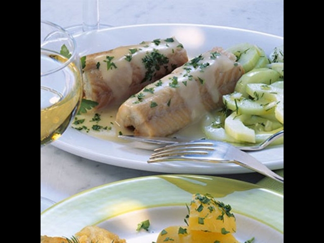Maso nakrájejte na špalíčky a obalte je v hladké mouce. V kastrole nebo hlubší pánvi rozehřejte máslo, vložte kousky ryby a zvolna opečte ze všech stran. Zalijte citronovou šťávou a vínem, osolte, opepřete a poduste doměkka (přibližně 15 minut). Nakonec posypte jemně nasekaným koprem nebo petrželkou. Podávejte s různě upravenými brambory a salátem.