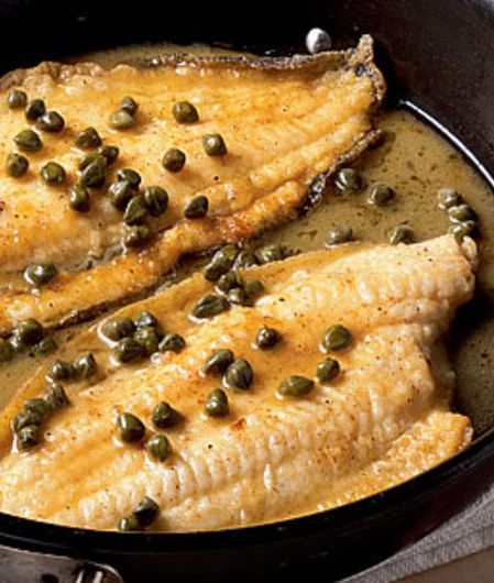 Prohlédněte rybu a případné kostičky odstraňte pinzetou. Ve velké mělké míse ochuťte mouku trochou soli a černého pepře. Pak v ní důkladně obalte filety. Přebytečnou mouku z ryby sklepejte. Do velké pánve nalijte olej a na nejvyšším plameni ho rozpalte. Vložte do něj rybu kůží dolů, po dvou minutách ji obraťte a upečte dozlatova – měla by postačit minuta nebo dvě. Rozdělte filety na nahřáté talíře, osolte a opepřete. Z pánve vytřete omastek, vraťte ji na plamen a vložte do ní máslo. Jakmile se rozpustí a začne lehce hnědnout, přidejte citronovou šťávu a případně kapary. Krátce omáčku promíchejte, přelijte jí ryby a podávejte.