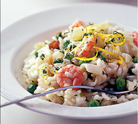 Cibuli a fenykl vložte do vhodné mísy, zakápněte olejem a mikrovlňte pět minut na vysoký výkon. Pak vmíchejte rýži, přelijte vývarem, zakryjte mísu talířem a pokračujte 10–15 minut na stejný výkon, nebo až bude rýže skoro uvařená. Přidejte mořské plody a hrášek, přikryjte a vařte opět na vysoký výkon dvě až tři minuty, aby rýže došla. Vmíchejte parmazán i citronovou šťávu a nechte chvíli odstát. Podávejte s petrželkou smíchanou s citronovou kůrou.