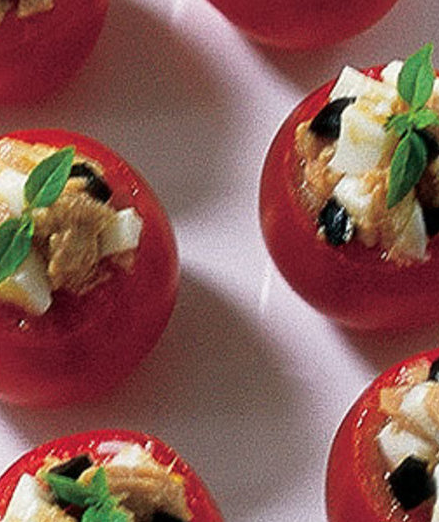 Na 6 porcí vydlabejte 6 větších pevných rajčat. Lehce osolte, opepřete a pokapejte citronovou šťávou. Nasekejte 250?g konzervovaného tuňáka, 50?g sekané cibule a bílky ze 2 natvrdo uvařených vajec. Přidejte po 1 lžíci oleje a octa, špetku soli, pepře a worcesterské omáčky. Naplňte rajčata, povrch posypte sekaným žloutkem a ozdobte olivou nebo kyselou okurkou.