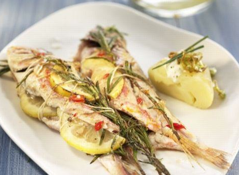 Troubu předehřejte na 230, horkovzdušnou na 210 stupňů. Prsty si namočte do oleje a vetřete ho do kůže ryby. Osolte a opepřete. Dvěma třetinami citronových plátků vyložte pekáč a položte na něj rybu. Břišní dutinu vyplňte zbylými kolečky citronů, nasekanými bylinami a rozmačkaným česnekem. Pečte tak půl hodiny, dokud maso není v nejsilnější části propečené. Při servírování opatrně oddělte kůži, pak nadzdvihněte kousek masa a oddělte ho od páteře. Z každé půlky ryby byste měli získat dvě porce. Rozdělte na talíře a podávejte ozdobené plátky pečených citronů a s omáčkou tarator.