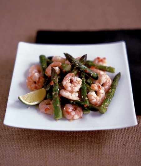 Olej rozehřejte ve velké silnostěnné pánvi nebo woku, přisypte zázvor i chřest a za stálého promíchávání minutu smažte. Přihoďte česnek, chilli papričku a krevety, dobře promíchejte a smažte ještě pět minut. Stále promíchávejte. Ochuťte sezamovým olejem, vsypte semínka a zakápněte limetovou šťávou; dochuťte. Podávejte s limetou.