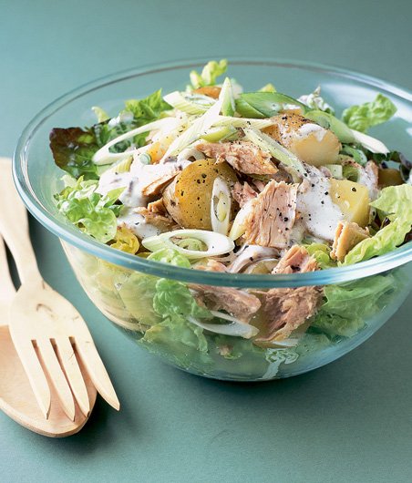 Brambory povařte doměkka; trvá to tak čtvrt hodiny. Sceďte je, ochlaďte pod studenou vodou a nakrájejte na plátky. Rozmačkejte sardelky s majonézou, podle chuti zastříkněte citronovou šťávou a opepřete. Salátové listy natrhejte do mísy. Přihoďte cibulku a brambory. Přidejte scezeného rozdrobeného tuňáka, zakápněte zálivkou a podávejte.