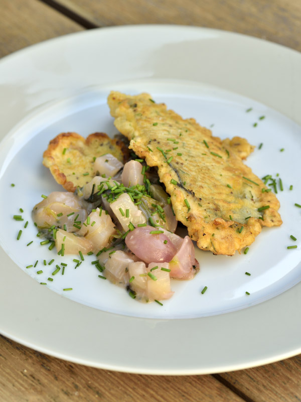 Z vajec, mouky, mléka, soli, drceného kmínu a pažitky vymícháme hustší těstíčko, v němž obalujeme porce ryby, které ihned smažíme dozlatova z obou stran v rozehřátém másle s trochou oleje. Necháme okapat na savém papíru.