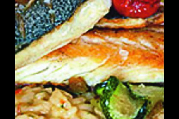8 stroužků česneku (neloupaných) se snítkou tymiánu nechte ve 100?ml olivového oleje hodinu táhnout na velmi mírném plameni. Na 30?ml olivového oleje zpěňte kostičky z 1 šalotky s několika lístky tymiánu. Přidejte 150?g kulatozrnné rýže arborio, nepropláchnuté, zalijte 100?ml bílého vína, nechte vyvařit a postupně přidávejte 300?ml drůbežího vývaru. Stále míchejte; další vývar vždy přidávejte až poté, co se vsákne předchozí dávka. Asi po osmnácti minutách přidejte kostičky z 40?g másla a 50?g parmazánu. Odstavte a vmíchejte lžíci bazalkového pesta se sušenými rajčaty. Po 100?g nakrájené cukety, lilku a různobarevných paprik osolte, opepřete, posypte nasekaným tymiánem, rozmarýnem a dobromyslí. Osmažte je buď na 100?ml olivového oleje na grilovací pánvi, nebo je opečte na grilu. Vsypte do kastrůlku, zakápněte olivovým olejem a nechte na teple marinovat. 8 malých rajčat vložte na osm minut do trouby předehřáté na 160 stupňů, pak je přidejte k ostatní zelenině. Na 20?g másla osmažte 30?g pokrájené cibule a 30?g pancetty či anglické slaniny, nakrájené na kostičky, zalijte 100?ml drůbežího vývaru a dvacet minut vařte. Rozmixujte se 100?ml 12% smetany, dochuťte solí a bílým pepřem a dejte stranou. 4 filátka z mořského ďasa po straně s kůží několikrát nařízněte a pomoučněte. Osolte, poprašte bílým pepřem a osmažte na olivovém oleji. Podávejte na rýži se zeleninou a stroužky česneku, přelité vyšlehanou pěnou a zakápnuté octem balsamico a bylinkovým olejem.