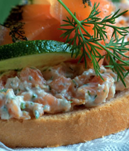 V misce prošlehejte všechny suroviny na pomazánku. Ochutnejte a případně dotáhněte cukrem a solí. Pomazánkou potřete veku. Chlebíčky ozdobte plátky lososa a citronem.
