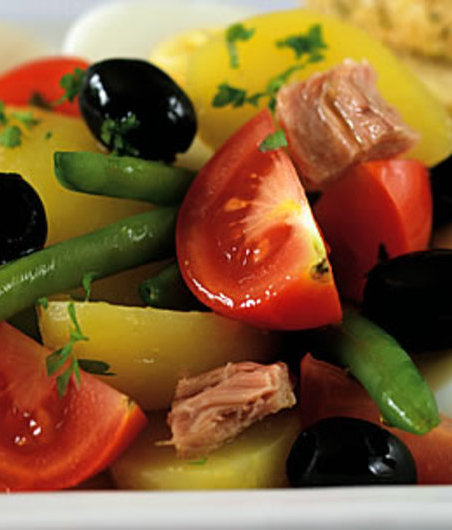 Uvařte vejce natvrdo (trvá to osm až deset minut) a po vychladnutí je rozkrájejte na čtvrtky. Mezitím ve velkém hrnci přiveďte k varu osolenou vodu. Pokud použijete čerstvé fazolky, odřízněte stopky a odstraňte vlákna. Fazolky vhoďte do vroucí vody a krátce je povařte doměkka; měly by stačit zhruba čtyři minuty. Pak fazolky sceďte a propláchněte studenou vodou. Ve velké misce promíchejte rajčata, vejce, tuňáka, olivy, petrželku a brambory. Na závěr přisypte fazolky a těsně před podáváním salát přelijte olivovým olejem smíchaným s citronovou šťávou.