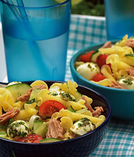 Těstoviny uvařte v osolené vodě podle návodu na obalu al dente (na skus), slijte a nechte vychladnout. Pokud spěcháte, můžete těstoviny prolít studenou vodou. Zeleninu nakrájejte na drobné kousky a smíchejte s těstovinami. Přidejte okapaný sýr a slitého tuňáka. Suroviny na zálivku prošlehejte vidličkou v hrnečku nebo malé misce. Zalijte salát, promíchejte, podle potřeby dochuťte a podávejte.