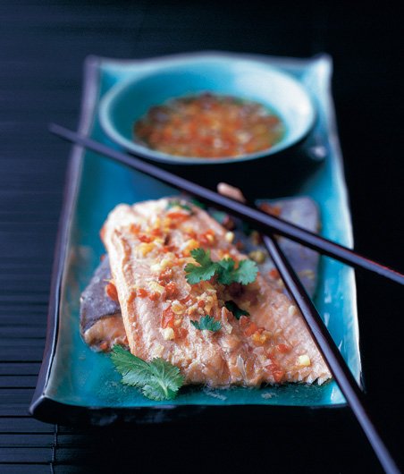 Troubu předehřejte na 200, horkovzdušnou na 180 stupňů, a připravte si dva kousky alobalu (měly by být velké tak, abyste do nich pohodlně zabalili filátka). Položte na ně rybu kůží dolů. Smíchejte citronovou trávu, jemně nasekaný zázvor, rybí omáčku, limetkovou šťávu, chilli papričku, česnek, cukr a koriandr. Částí vzniklé omáčky potřete dvě filátka a přikryjte je druhým plátkem (kůží navrch) tak, aby vznikl jakýsi sendvič. Každý zvlášť pevně zabalte do alobalu. Balíčky s rybou vložte do trouby a pečte dvanáct až patnáct minut. Pak je nechte trochu vychladnout a celé neste na stůl. Podávejte se zbylou omáčkou, případně s rýží – nejlépe jasmínovou.