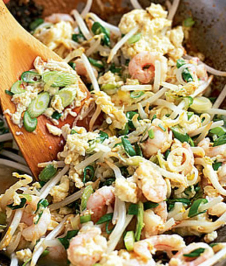 Rozpalte olej ve woku či pánvi a půl minuty prudce smažte krevety, aby chytly barvu. Přisypte zázvor, klíčky a půl cibulek, pečte třicet vteřin, snižte plamen a na kraj pánve rozklepněte vejce. Až vejce ztuhnou, promíchejte je s ostatními surovinami. Přidejte sójovou omáčku a nechte ji pár vteřin prskat. Podávejte se zbytkem cibulky a dochuťte sójovou omáčkou.
