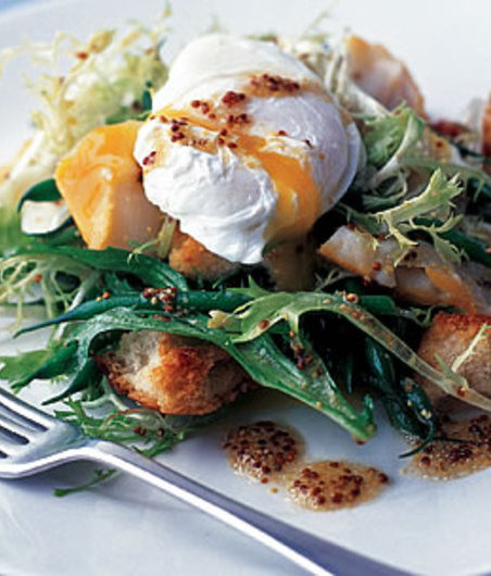 Do hrnce nalijte litr a půl vody a dejte ji vařit. Než začne vřít, připravte zálivku: prošlehejte spolu hořčici, ocet, tři lžíce oleje, lžíci vody a sůl. Zapněte gril v troubě nebo troubu předehřejte na maximum. Bagetu na plechu zakápněte zbylým olejem a opečte dozlatova (8–10 minut). Mezitím vhoďte fazolky do kastrolu s vroucí vodou a tři až pět minut je vařte. Pak je vylovte děrovanou naběračkou, vsypte do mísy a zakápněte trochou zálivky. Do vody vložte rybu, stáhněte plamen a pět minut mírně povařte. Vyjměte, kápněte do vody trochu octa a z talířku nebo naběračky nechte do hrnce vklouznout rozklepnuté vejce. Bílek přehrňte přes žloutek a vejce povařte asi tři minuty takzvaně do ztracena (bílek by měl ztuhnout a žloutek zůstat tekutý). Vajíčko vyjměte děrovanou naběračkou a nechte na ubrousku okapat. Stejně připravte i druhé. Opláchnuté listy salátu dejte do mísy a rozdrobte na ně rybu. Přidejte krutony, fazolky a většinu zálivky a všechno promíchejte. Rozdělte na talíře, navrch položte vejce, zakápněte zbylou zálivkou. Podávejte ještě teplé.