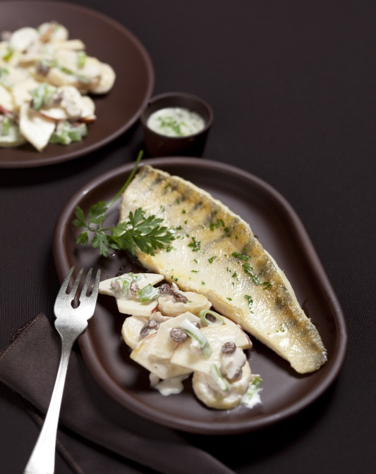 Filátka z candáta krátce opláchneme pod studenou vodou a osušíme. Máslo rozpustíme, osolíme, přimícháme citronovou kůru a touto směsí potřeme připravená filátka. Zakryjeme je mikrotenovou fólií a uložíme v chladničce. Rozinky krátce povaříme v bílém víně a necháme vychladnout. Uvařené brambory oloupeme a nakrájíme na plátky. Jablka omyjeme, nakrájíme na čtvrtky, zbavíme je jádřinců a čtvrtky nakrájíme ještě na plátky. V míse smícháme majonézu se zakysanou smetanou, olejem, křenem, rozinkami a směs osolíme. Přidáme brambory, jablka, očištěnou nakrájenou jarní cibulku a ořechy a salát opatrně promícháme. Pekáček vytřeme olivovým olejem, položíme do něj filátka, posypeme je lehce petrželkou a vložíme na 6-8 minut do trouby rozpálené na 220 °C. Upečená filátka rozdělíme na talíře a doplníme salátem.