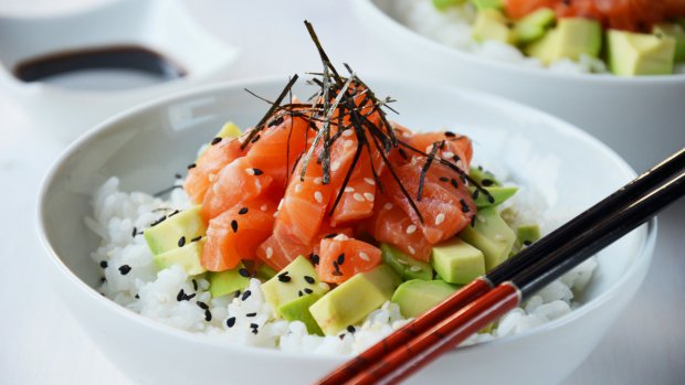 Sushi rýži důkladně propláchněte studenou vodou. Ideálně zaléváním studenou vodou, promícháváním a sléváním zabarvené vody až do okamžiku, kdy je voda téměř čirá (až 7–8 opakování). Propláchnutou rýži dejte do hrnce, zalijte studenou vodou (1 díl vody na 1 díl rýže), přiklopte pokličkou, přiveďte k varu a ihned ztlumte. Na mírném ohni vařte 15 minut. Poté hrnec stáhněte z ohně a nechte dojít 5 minut pod pokličkou. V misce smíchejte rýžový ocet, cukr a sůl. Míchejte až do úplného rozpuštění cukru a soli. Můžete si pomoci i mírným zahřátím. Uvařenou sushi rýži rozprostřete na plech, rovnoměrně pokapejte připraveným sushi octem a promíchejte dřevěnou vařečkou. Rýži musíte promíchávat velmi opatrně, abyste ji nerozmačkali. Rýži nechte vychladnout. Těsně před podáváním nakrájejte lososa a avokádo na kostičky. Vychladlou rýži rozdělte do misek, poklaďte kostičkami avokáda a lososa a posypte sezamem. Ozdobte nakrájenou řasou nori a ihned podávejte se sójovou omáčkou a wasabi.