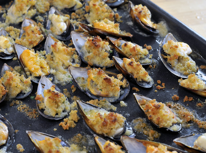 Očištěné slávky otevřeme a plné půlky naskládáme na plech. Strouhanku smícháme s nastrouhaným sýrem, nasekanou petrželkou, drceným česnekem, přidáme pár kapek olivového oleje. Tuto směs klademe na slávky, ještě zakápneme olejem a takto připravené gratinujeme v rozpálené troubě 5 minut při 180 °C. Po vyjmutí z trouby zakápneme citronem a podáváme.