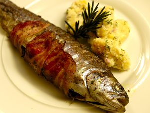 Ryby obalíme plátky slaniny, přendáme na plech s pečícím papírem a pečeme 10-15 minut při 180 °C.