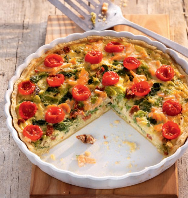 Na těsto nasekejte máslo a prohněťte s ostatními přísadami. Z těsta vytvarujte kouli, zabalte do fólie a dejte na 1 hodinu do chladna. Formu vytřete máslem. Troubu rozehřejte na 200 °C. Na pracovní ploše poprášené moukou rozválejte těsto a vyložte jím formu. Těsto vícekrát propíchejte vidličkou a předpékejte na středním stupni asi 10 minut. Po vyjmutí nechte vychladnout. Na náplň očistěte kapustu, opláchněte a odstřeďte dosucha. Nakrájejte ji na kousky (potřebujete asi 500 g). V hrnci rozehřejte olej a orestujte na něm kapustu. Podlijte bílým vínem, osolte, opepřete, ochuťte muškátovým oříškem. Duste do poloměkka. Nasekejte sušená rajčata, uzeného lososa rozdělte na menší kousky. Ve smetaně a crème fraîche rozšlehejte vejce, dochuťte solí a pepřem. Směs spojte s kapustou a nasekanými rajčaty. Omyjte cherry rajčátka, rozpulte je a odstraňte vnitřek. Náplň rozprostřete na korpus, navrch upravte rajčátka a quiche pečte na prostředním stupni asi 40 minut.