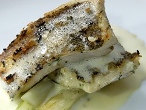 Z pažitky, trochy oleje, citrónové šťávy, soli a pepře připravíme marinádu, do které alespoň na hodinu naložíme steaky z candáta. Poté candáta grilujeme pouze z jedné strany, kůží dolů. Řapíkatý celer oloupeme, nakrájíme na hranolky, dáme do trouby předehřáte na 200 C, osolíme, opepříme a zakápneme olivovým olejem.V míse rozmícháme žloutky spolu s vývarem, bílým vínem a citrónovou šťávou, solí a pepřem. Mísu vložíme do vodní lázně a metlou mícháme do zhoustnutí. Touto omáčkou přelijeme řapíkatý celer a steak z candáta.