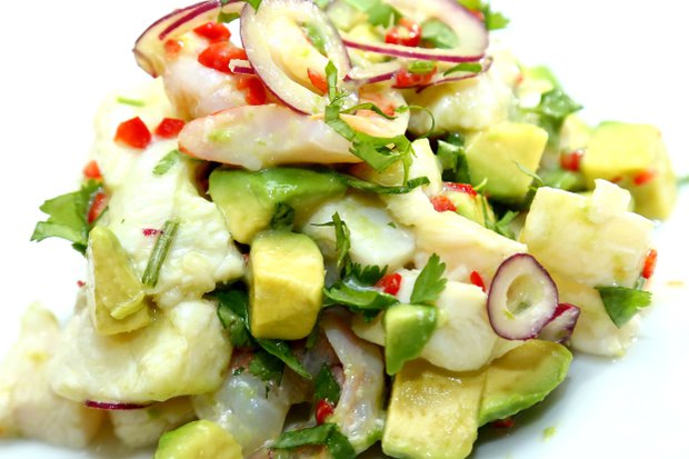 Nejdříve si připravte marinádu: do misky vymačkejte šťávu z citronů a limet a vmíchejte nakrájenou chilli papričku. Krevety očistěte, nařízněte a orestujte na kapce olivového oleje. Osolte. Rybu nakrájejte na kostičky, vložte do marinády, osolte, přidejte červenou cibuli nakrájenou na kolečka a orestované krevety. Avokádo rozpulte, oloupejte, nakrájejte na kostičky a přidejte do misky. Na závěr vmíchejte nasekaný koriandr a podávejte.