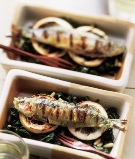 Ryby propláchněte pod tekoucí vodou a pak je vně i uvnitř důkladně osušte. Citrony nakrájejte na tenké plátky. Piniová jedérka nebo mandle vsypte na silnostěnnou nepřilnavou pánev a krátce je nasucho opražte (budou mít výraznější chuť). Špenátové lístky důkladně propláchněte a nechte okapat. Do pánvičky po piniích kápněte trochu oleje, rozehřejte ho, vsypte špenát a nechte ho asi tři minuty zavadnout. Osolte, opepřete a udržujte v teple. Grilovací pánev potřete olejem a opečte na ní osolené a opepřené ryby, z každé strany tři až čtyři minuty. Můžete je také ogrilovat na mřížce přímo v troubě. Podávejte na ‚podestýlce‘ ze špenátu, pinií a citronu.