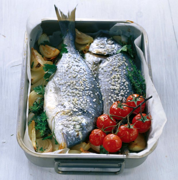 Oloupanou cibuli nakrájejte na klínky a na olivovém oleji 5 minut opékejte. Vykuchanou a očištěnou pražmu vytřete rozetřeným česnekem, osolte, opepřete a vložte snítku tymiánu a jeden bobkový list. Pekáček vyložte opečenou cibulí, zasypte sekanou petrželkou, osolte a opepřete. Na směs položte ryby, které obložte rajčátky, zbytkem bylinek a vše zastříkněte vínem. Pečte 30 minut při 170 °C. Po 15 minutách ryby otočte. Rajčátka můžete péct i se stonky. Podávejte s bramborem nebo s rýží.
