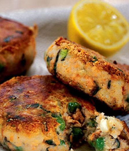 Brambory rozmačkejte na kaši. V míse rozdělte lososa na kousky a odstraňte případné zbytky kůže nebo větší kosti. Přidejte hrášek, mátu, tatarku a rozmačkané brambory, opepřete a osolte. Důkladně promíchejte a pomoučněnýma rukama vytvarujte osm placek. Ty pak poprašte moukou. Ve velké pánvi rozpalte na středním plameni olej. Karbanátky smažte ve dvou várkách. Opatrně je otáčejte a smažte po každé straně dozlatova; měly by stačit tři až čtyři minuty. Podávejte s citronem a zeleným salátem.