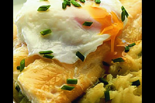 Filé vložte do mělké misky a do poloviny je zalijte mlékem. Překryjte potravinovou fólií a vařte v mikrovlnce na vysoký výkon čtyři až pět minut, dokud filé nepůjde snadno rozdělit na kousky. Anebo ho spolu s mlékem prohřejte v rendlíku. Mezitím v kastrůlku přiveďte k varu vodu a přilijte do ní ocet. Vejce vyklepněte do naběračky a nechte je vklouznout do mírně vroucí vody. Bílek trochu přehrňte přes žloutek; jakmile bílek zbělá a zpevní, zase vejce vyjměte; nejlíp to jde děrovanou naběračkou. Brambory rozšťouchejte s máslem a promíchejte s podušenou kapustou. Osolte, opepřete a vmíchejte polovinu pažitky. Rozdělte kaši na talíře, navrch dejte filé i ztracené vejce a jídlo ozdobte zbytkem pažitky.