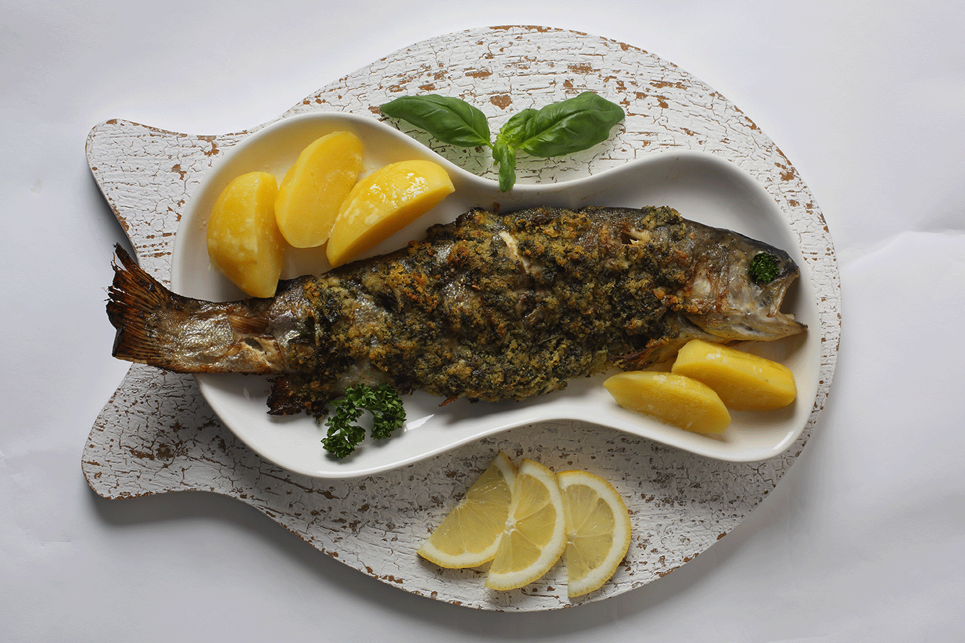 Oloupaný česnek utřeme se solí a promícháme s najemno nakrájenou petrželkou a bazalkou. Pstruha omyjeme, necháme mu hlavu a ocas. Vnitřek pokapeme citronovou šťávou a pstruha potřeme polovinou bylinkové směsi. Zlehka ho poprášíme moukou a osmažíme v pánvi na rozehřátém másle asi půl minuty z každé strany. Do druhé části bylinkové směsi přimícháme větší část másla a strouhanku. Pstruha položíme do zapékací mísy vymazané máslem a potřeme ho na povrchu druhou částí bylinkové směsi, do které jsme přimíchali strouhanku a máslo. Pstruha pokapeme citronovou šťávou, vložíme do trouby vyhřáté na 190 °C a pečeme zakryté asi 25 minut, dokud krusta na povrchu nezezlátne (ke konci pečení pstruha odkryjeme). Podáváme s vařenými bramborami.