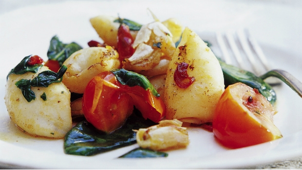 Kalamáry pokapeme citrónovou šťávou a necháme hodinu marinovat. V pánvi zahřejeme olivový olej a opékáme na něm šalotku, přidáme nakrájená oloupaná rajčata bez semínek, špetku cukru, nakrájený česnek, osmahneme a podlijeme vínem, přidáme nasekanou bazalku a kalamáry s marinadou. Vše dusíme ještě asi 20 minut, ochutíme solí a pepřem a podáváme. Můžeme podávat s bagetou nebo přimíchat do těstovin.