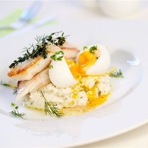 Najemno nakrájenou šalotku zlehka zpěníme na olivovém oleji. Přidáme rýži, orestujeme a zalijeme vínem. Pomalu vaříme, postupně dle potřeby přiléváme vývar, dokud se rýže neuvaří na skus. Poté přidáme mandlový nápoj a nasekaný kopr. Vejce vaříme ve vroucí vodě 7 minut, oloupeme a osolíme. Filátko z mořského vlka osolíme a opečeme na rozpálené pánvi, ke konci pečení přidáme bylinky.