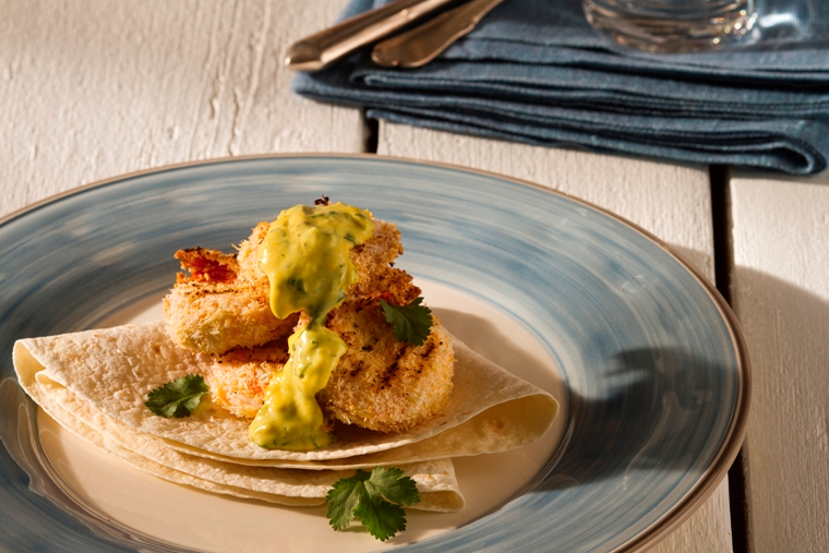 Krevety zbavíme skořápek, ponecháme pouze kousek na ocasu. Horní stranu každé krevety nařízneme a vyjmeme střívko (tmavá nitka). Očištěné krevety namočte do lehce promíchaných vajec, pak je obalíme v kokosu a rychle opečeme z obou stran na grilu, aby zůstaly šťavnaté. Chlebové placky nahřejeme nebo lehce nasucho opečeme a přehneme na půlku a pak ještě na čtvrtku. Rozdělíme je na talíře, přidáme opečené krevety a přelijeme je omáčkou, kterou připravíme smícháním uvedených surovin.