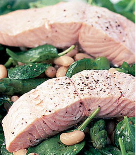 Do hrnce dejte napařovací vložku, nalijte pod ni vařící vodu a postavte na sporák tak, aby se voda stále mírně vařila. Na podložku dejte filátka lososa (můžete je podle chuti osolit a opepřit), přikryjte poklicí a nechte vařit asi tři minuty, dokud maso nezesvětlá. Stonky chřestu oloupejte škrabkou na brambory a přidejte je k rybě. Společně povařte v páře ještě čtyři až pět minut, aby chřest zkřehl a losos byl uvařený. Mezitím prošlehejte suroviny na zálivku. Do mísy vsypte fazole a špenát, přidejte povařený chřest a přimíchejte zálivku. Směs rozdělte na talíře a nahoru položte kousky lososa.