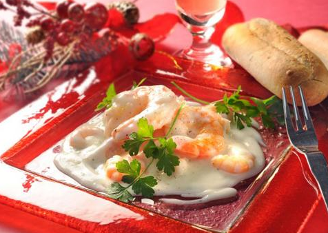 Máslo rozpusťte na pánvi, přidejte najemno nakrájenou cibulku a pokrájený česnek. Až cibule zesklovatí, poprašte ji moukou a nechte zpěnit. Přilijte smetanu, přiveďte k varu a chvíli povařte. Ochuťte solí, pepřem a citronovou šťávou. V kastrůlku prohřejte krevety a vložte je do omáčky, zamíchejte, zmírněte teplotu a přidejte sýr. Stále míchejte, dokud se sýr v omáčce nerozpustí. Podávejte s čerstvou bagetkou.