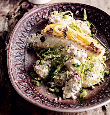 Brambory si předvaříme. Studené oloupeme, nakrájíme na plátky a podlijeme teplým zel.vývarem. Necháme 15 min.odstát. Poté přidáme majonézu, hořčici, sůl. pepř a trochu octa. Přidáme trochu oleje, nasekanou petržel a cibuli. Pořádně promícháme a dáme vychladit do ledničky. Před servírováním můžeme přidat ještě trochu oleje podle vlastní chuti. Rybu naporcujeme, posolíme, popepříme a zakápneme šťávou z citronu, necháme 15 min marinovat a pečeme v troubě.