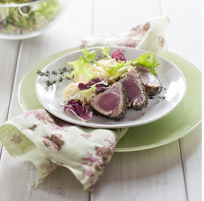 Oloupané brambory překrájíme, zalijeme je horkou vodou, osolíme a uvaříme doměkka. Slijeme je, rozšťoucháme, zalijeme horkou smetanou, přidáme strouhaný parmazán a vše rozšťoucháme na hladkou kaši, kterou podle potřeby ještě dochutíme solí a uložíme v teple. Tuňáka nakrájíme na 4 stejné válečky. Osolíme je, opepříme a pomalu opečeme ze všech stran v pánvi na olivovém oleji tak, aby zůstal tuňák uprostřed růžový. Pak válečky obalíme v sušeném tymiánu. Z parmazánové kaše vytvarujeme pomocí dvou lžic namočených v horké vodě větší noky, rozdělíme je po třech na talíře a každou porci doplníme válečkem tuňáka nakrájeným na tři plátky. Nakonec každou porci doplníme opranými, odkapanými a na kousky natrhanými listy kadeřavého salátu pokapanými citronovou šťávou a ihned podáváme.