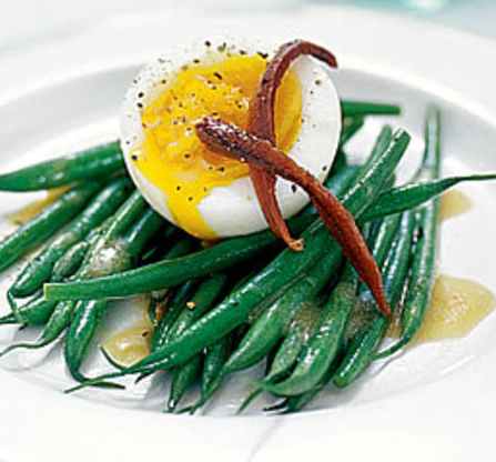 Fazolky povařte v osolené vodě nebo v páře 6–8 minut, aby zkřehly. Pak je na cedníku prolijte studenou vodou – zachovají si díky tomu křupavost a jasnou barvu. Nechte je oschnout na kuchyňském papíru. Mezitím uvařte vejce. Po 4 minutách je ochlaďte pod proudem vody a oloupejte. V misce prošlehejte ocet, hořčici, cukr, olej a trochu soli a pepře. Fazolky rozdělte na talíře, na každou porci položte půlku vejce a ještě ho ozdobte proužky ančoviček. Zakápněte trochou hořčičné zálivky, případně dochuťte pepřem.