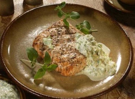Filety z lososa osolíme, opepříme a posypeme nasekaným tymiánem. V pánvi rozehřejeme kousek másla a rybu na něm opečeme. V druhé pánvi rozpálíme olej, na něm podusíme nakrájené houby, přidáme zeleninový vývar, do kterého jsme dali lžičku šafránu. Povaříme, přidáme jogurt (kdo se nebojí o linii, může použít smetanu) a nasekanou bazalku. Znovu provaříme a případně zahustíme omáčku mouku. Rybu podáváme přelitou šafránovou omáčkou bez přílohy, nebo s rýží.