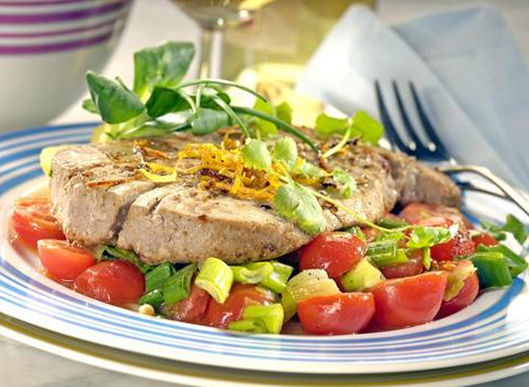 Zakápněte šťávou z pomeranče a nechte chvilku rozležet 4 porce čerstvého tuňáka (po cca 150 g). Pak porce osušte, osolte, posypte drceným bílým pepřem, lžící podrcených koriandrových semínek, lžící nastrouhané pomerančové kůry z chemicky neošetřeného nebo dobře vydrhnutého pomeranče a opečte je na pánvi potřené olejem z obou stran.