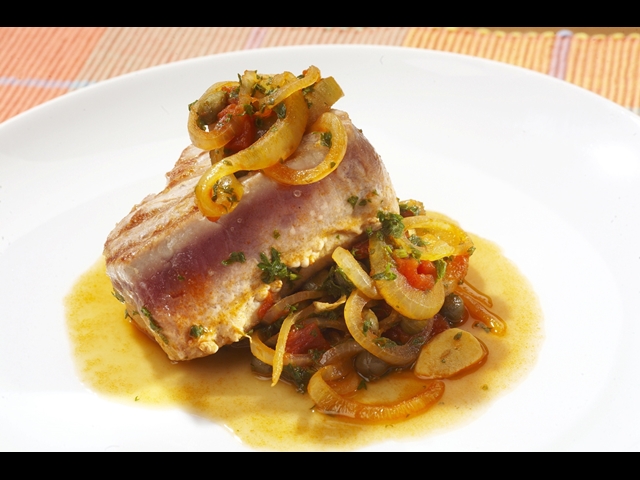 Tuňáka osolíme z obou stran. V mělkém hrnci osmahneme na rozpáleném oleji tuňáka z obou stran dorůžova a přendáme ho do horké nádoby, aby nám zcela nevychladl. Do hrnce po tuňákovi přidáme cibuli a česnek, osmahneme, přiklopíme a na velmi mírném ohni pomalu dusíme. Zvýšíme plamen, přidáme rajčata nebo rajčatové pyré, petrželku, ocet a okapané kapary. Vaříme 5 minut, poté přidáme rybí vývar a podle chuti dosolíme. Tuňáka položíme na zeleninovou směs, zakryjeme a prohříváme ještě asi 5 minut. Podáváme přelité rajčatovou