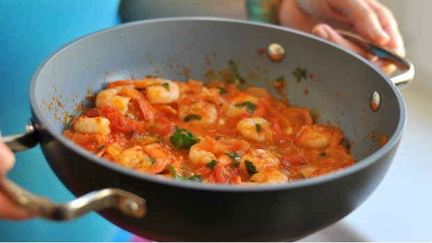Z dobře omytého citrónu nastrouháme kůru a vymačkáme šťávu. Česnek nadrobno nakrájíme. Oloupanou cibuli nakrájíme na plátky, rajče na kostky. Na rozehřátém oleji zprudka osmahneme krevety, nasekaný tymián, citrónovou kůru i šťávu, česnek, cibuli, rajče. Vše podlijeme vínem, podle chuti osolíme, opepříme, přidáme lístky bazalky a na prudkém ohni restujeme 3-5 minut.