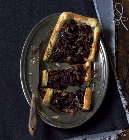 Troubu předehřejte na 200 oC. V pánvi na oleji opékejte asi 20–25 minut cibuli, až zezlátne a zkaramelizuje. Vmíchejte ocet, cukr, sůl a pepř a duste asi 5 minut, až směs začne houstnout a sirupovatět. Oba pláty těsta překrojte ještě napůl a položte na plech vyložený pečicím papírem. Okraje ohněte tak, abyste z těsta získali asi centimetr hluboké misky. Rozdělte na ně cibulovou směs a na tu dejte olivy, sardele a tymián. Okraje potřete žloutkem a pečte v troubě asi 12–15 minut dozlatova.
