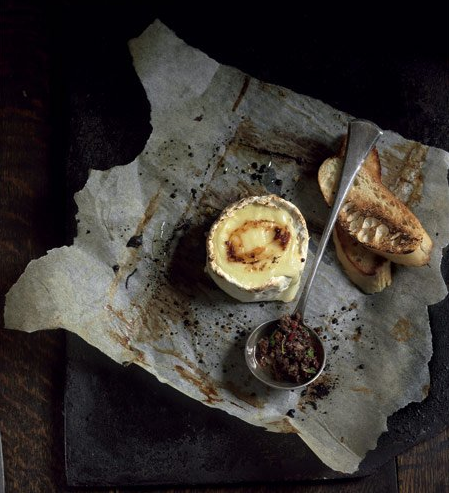 Rozmixujte olivy, kapary, sardele, 1 stroužek česneku, chilli, bazalku, petrželku a 2 lžíce oleje na hladkou pastu. Rozdrťte zbylý stroužek česneku a promíchejte ho se zbývajícím olejem. Rozložte na plech vyložený pečicím papírem sýr řeznou stranou vzhůru a pokapejte česnekovým olejem. Pod rozehřátým grilem rozpékejte 2–3 minuty dozlatova. Podávejte s tapenádou a opečeným chlebem.