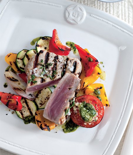 Filet tuňáka rozdělte na čtyři porce, osolte a opepřete. Rozehřejte dřevěné uhlí v grilu a tuňáka nad ním opečte (mřížku předtím můžete potřít slaninou nebo štětcem s kapkou oleje, aby se maso nepřichytilo); stačit by měly dvě minuty po každé straně. Hotový steak pokapejte olivovým olejem a posypte čerstvým tymiánem.Zeleninu pokrájejte na větší kusy a opečte nasucho na grilu. Stejně jako tuňáka pokapejte zeleninu olejem a dochuťte solí, pepřem a bylinkami. Poloviny rajčat osolte, opepřete a ogrilujte nejdřív řeznou stranou dolů. Pak otočte, posypte opečenou plochu parmazánem a nechte ho rozpustit. Všechny suroviny na pesto vychlaďte a pak krátce a zprudka promixujte. Vychlazení a rychlost jsou důležité, aby se pesto při mixování, kdy se suroviny zahřívají, nesrazilo. Pokud se tak i přesto stane, nechte pesto vychladit a pak ho znovu prošlehejte metlou. Na talíř dejte vždy porci ryby, grilovanou zeleninu a rajčata s parmazánem, ozdobená trochou pesta.