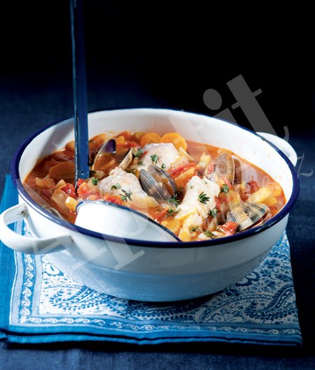 Nechte ryby mírně povolit a nakrájejte je na větší kousky (cca o velikosti sousta). V kastrolu na rozehřátém oleji opékejte cibuli 3 minuty dosklovita. Přidejte celer, mrkev, fenykl a česnek a míchejte na malém plameni dalších 5 minut. Čerstvá rajčata spařte, oloupejte a pokrájejte, konzervovaná jen pokrájejte nahrubo. Přidejte je do kastrolu společně s rajským protlakem, vínem a tymiánem. Přiveďte k varu a vařte 5 minut. Přidejte vývar a vařte dalších 5 minut. Osolte a opepřete. Ztlumte, vložte ryby a vařte 4–5 minut, až zbělají a zpevní. Přidejte mušle a vařte, až se otevřou. Podávejte s rozpečenou ciabattou, pokapané zbývajícím olivovým olejem a ozdobené tymiánem.